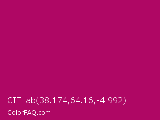 CIELab 38.174,64.16,-4.992 Color is a normal magenta color and the nearest color is Lipstick #ab0563. Hex code #af0764 and RGB value is rgb(175,7,100). In RGB color space, this color is composed of 69% red, 3% green, 39% blue, In CMYK color space, this color is composed of 0% cyan, 96% magenta, 43% yellow , 31% black , In HSL color space, this color has a hue angle of 327° , 92% saturation and 36% lightness.