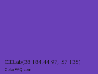 CIELab 38.184,44.97,-57.136 Color is a normal violet color and the nearest color is Studio #714ab2. Hex code #6a40b8 and RGB value is rgb(106,64,184). In RGB color space, this color is composed of 42% red, 25% green, 72% blue, In CMYK color space, this color is composed of 42% cyan, 65% magenta, 0% yellow , 28% black , In HSL color space, this color has a hue angle of 261° , 48% saturation and 49% lightness.