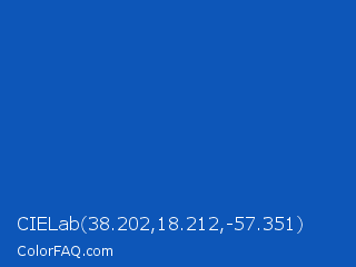 CIELab 38.202,18.212,-57.351 Color is a normal blue color and the nearest color is Sapphire #0f52ba. Hex code #0d56b8 and RGB value is rgb(13,86,184). In RGB color space, this color is composed of 5% red, 34% green, 72% blue, In CMYK color space, this color is composed of 93% cyan, 53% magenta, 0% yellow , 28% black , In HSL color space, this color has a hue angle of 214° , 87% saturation and 39% lightness.
