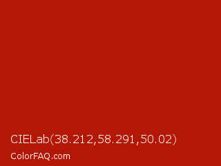 CIELab 38.212,58.291,50.02 Color is a normal red color and the nearest color is Milano Red #b81104. Hex code #b31705 and RGB value is rgb(179,23,5). In RGB color space, this color is composed of 70% red, 9% green, 2% blue, In CMYK color space, this color is composed of 0% cyan, 87% magenta, 97% yellow , 30% black , In HSL color space, this color has a hue angle of 6° , 95% saturation and 36% lightness.