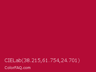 CIELab 38.215,61.754,24.701 Color is a normal red color and the nearest color is Shiraz #b20931. Hex code #b40b36 and RGB value is rgb(180,11,54). In RGB color space, this color is composed of 71% red, 4% green, 21% blue, In CMYK color space, this color is composed of 0% cyan, 94% magenta, 70% yellow , 29% black , In HSL color space, this color has a hue angle of 345° , 88% saturation and 37% lightness.