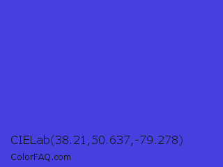 CIELab 38.21,50.637,-79.278 Color is a normal indigo color and the nearest color is Iris #5a4fcf. Hex code #4540de and RGB value is rgb(69,64,222). In RGB color space, this color is composed of 27% red, 25% green, 87% blue, In CMYK color space, this color is composed of 69% cyan, 71% magenta, 0% yellow , 13% black , In HSL color space, this color has a hue angle of 242° , 71% saturation and 56% lightness.
