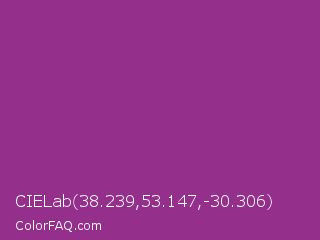 CIELab 38.239,53.147,-30.306 Color is a normal magenta color and the nearest color is Vivid Violet #803790. Hex code #942f8c and RGB value is rgb(148,47,140). In RGB color space, this color is composed of 58% red, 18% green, 55% blue, In CMYK color space, this color is composed of 0% cyan, 68% magenta, 5% yellow , 42% black , In HSL color space, this color has a hue angle of 305° , 52% saturation and 38% lightness.
