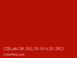 CIELab 38.262,59.914,50.282 Color is a normal red color and the nearest color is Milano Red #b81104. Hex code #b51105 and RGB value is rgb(181,17,5). In RGB color space, this color is composed of 71% red, 7% green, 2% blue, In CMYK color space, this color is composed of 0% cyan, 91% magenta, 97% yellow , 29% black , In HSL color space, this color has a hue angle of 4° , 95% saturation and 36% lightness.