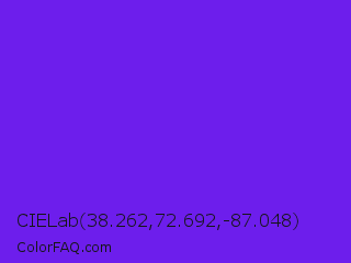 CIELab 38.262,72.692,-87.048 Color is a normal violet color and the nearest color is Han Purple #5218fa. Hex code #6d1eec and RGB value is rgb(109,30,236). In RGB color space, this color is composed of 43% red, 12% green, 93% blue, In CMYK color space, this color is composed of 54% cyan, 87% magenta, 0% yellow , 7% black , In HSL color space, this color has a hue angle of 263° , 84% saturation and 52% lightness.