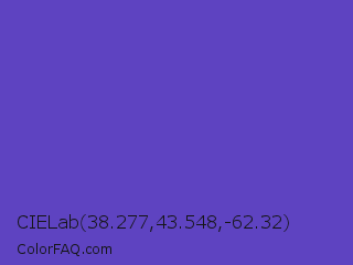 CIELab 38.277,43.548,-62.32 Color is a normal indigo color and the nearest color is Plump Purple #5946b2. Hex code #5e43c1 and RGB value is rgb(94,67,193). In RGB color space, this color is composed of 37% red, 26% green, 76% blue, In CMYK color space, this color is composed of 51% cyan, 65% magenta, 0% yellow , 24% black , In HSL color space, this color has a hue angle of 253° , 50% saturation and 51% lightness.