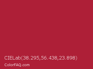 CIELab 38.295,56.438,23.898 Color is a normal red color and the nearest color is Deep Carmine #a9203e. Hex code #ae1f37 and RGB value is rgb(174,31,55). In RGB color space, this color is composed of 68% red, 12% green, 22% blue, In CMYK color space, this color is composed of 0% cyan, 82% magenta, 68% yellow , 32% black , In HSL color space, this color has a hue angle of 350° , 70% saturation and 40% lightness.