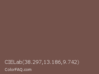 CIELab 38.297,13.186,9.742 Color is a normal red color and the nearest color is Ferra #704f50. Hex code #74524b and RGB value is rgb(116,82,75). In RGB color space, this color is composed of 45% red, 32% green, 29% blue, In CMYK color space, this color is composed of 0% cyan, 29% magenta, 35% yellow , 55% black , In HSL color space, this color has a hue angle of 10° , 21% saturation and 37% lightness.