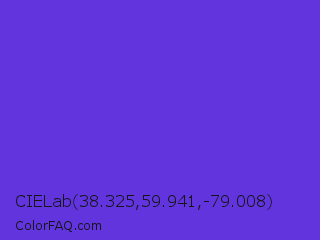 CIELab 38.325,59.941,-79.008 Color is a normal indigo color and the nearest color is Majorelle Blue #6050dc. Hex code #6134de and RGB value is rgb(97,52,222). In RGB color space, this color is composed of 38% red, 20% green, 87% blue, In CMYK color space, this color is composed of 56% cyan, 77% magenta, 0% yellow , 13% black , In HSL color space, this color has a hue angle of 256° , 72% saturation and 54% lightness.