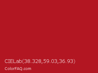 CIELab 38.328,59.03,36.93 Color is a normal red color and the nearest color is Carnelian #b31b1b. Hex code #b31622 and RGB value is rgb(179,22,34). In RGB color space, this color is composed of 70% red, 9% green, 13% blue, In CMYK color space, this color is composed of 0% cyan, 88% magenta, 81% yellow , 30% black , In HSL color space, this color has a hue angle of 355° , 78% saturation and 39% lightness.