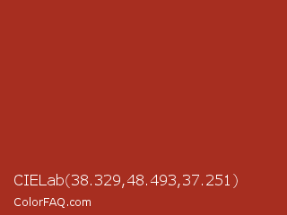 CIELab 38.329,48.493,37.251 Color is a normal red color and the nearest color is Roof Terracotta #a62f20. Hex code #a72e20 and RGB value is rgb(167,46,32). In RGB color space, this color is composed of 65% red, 18% green, 13% blue, In CMYK color space, this color is composed of 0% cyan, 72% magenta, 81% yellow , 35% black , In HSL color space, this color has a hue angle of 6° , 68% saturation and 39% lightness.