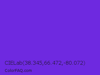 CIELab 38.345,66.472,-80.072 Color is a normal violet color and the nearest color is Blue Violet #8a2be2. Hex code #6e29e0 and RGB value is rgb(110,41,224). In RGB color space, this color is composed of 43% red, 16% green, 88% blue, In CMYK color space, this color is composed of 51% cyan, 82% magenta, 0% yellow , 12% black , In HSL color space, this color has a hue angle of 263° , 75% saturation and 52% lightness.