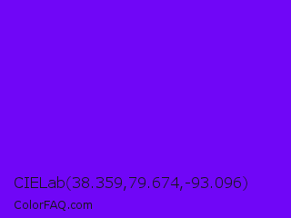 CIELab 38.359,79.674,-93.096 Color is a normal violet color and the nearest color is Electric Indigo #6f00ff. Hex code #7006f7 and RGB value is rgb(112,6,247). In RGB color space, this color is composed of 44% red, 2% green, 97% blue, In CMYK color space, this color is composed of 55% cyan, 98% magenta, 0% yellow , 3% black , In HSL color space, this color has a hue angle of 266° , 95% saturation and 50% lightness.