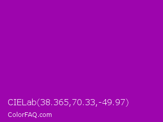 CIELab 38.365,70.33,-49.97 Color is a normal magenta color and the nearest color is Heliotrope Magenta #aa00bb. Hex code #9d05ad and RGB value is rgb(157,5,173). In RGB color space, this color is composed of 62% red, 2% green, 68% blue, In CMYK color space, this color is composed of 9% cyan, 97% magenta, 0% yellow , 32% black , In HSL color space, this color has a hue angle of 294° , 94% saturation and 35% lightness.