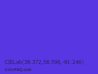 CIELab 38.372,58.596,-81.246 Color is a normal indigo color and the nearest color is Majorelle Blue #6050dc. Hex code #5837e2 and RGB value is rgb(88,55,226). In RGB color space, this color is composed of 35% red, 22% green, 89% blue, In CMYK color space, this color is composed of 61% cyan, 76% magenta, 0% yellow , 11% black , In HSL color space, this color has a hue angle of 252° , 75% saturation and 55% lightness.