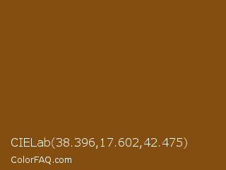 CIELab 38.396,17.602,42.475 Color is a dark orange color and the nearest color is Rusty Nail #86560a. Hex code #834e10 and RGB value is rgb(131,78,16). In RGB color space, this color is composed of 51% red, 31% green, 6% blue, In CMYK color space, this color is composed of 0% cyan, 40% magenta, 88% yellow , 49% black , In HSL color space, this color has a hue angle of 32° , 78% saturation and 29% lightness.