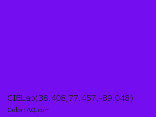 CIELab 38.408,77.457,-89.048 Color is a normal violet color and the nearest color is Electric Indigo #6f00ff. Hex code #740ef0 and RGB value is rgb(116,14,240). In RGB color space, this color is composed of 45% red, 5% green, 94% blue, In CMYK color space, this color is composed of 52% cyan, 94% magenta, 0% yellow , 6% black , In HSL color space, this color has a hue angle of 267° , 89% saturation and 50% lightness.