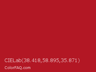 CIELab 38.418,58.895,35.871 Color is a normal red color and the nearest color is Carnelian #b31b1b. Hex code #b31724 and RGB value is rgb(179,23,36). In RGB color space, this color is composed of 70% red, 9% green, 14% blue, In CMYK color space, this color is composed of 0% cyan, 87% magenta, 80% yellow , 30% black , In HSL color space, this color has a hue angle of 355° , 77% saturation and 40% lightness.