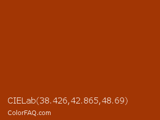 CIELab 38.426,42.865,48.69 Color is a normal orange color and the nearest color is Fire #aa4203. Hex code #a23604 and RGB value is rgb(162,54,4). In RGB color space, this color is composed of 64% red, 21% green, 2% blue, In CMYK color space, this color is composed of 0% cyan, 67% magenta, 98% yellow , 36% black , In HSL color space, this color has a hue angle of 19° , 95% saturation and 33% lightness.