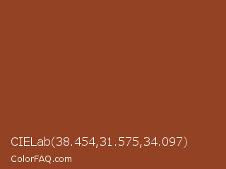 CIELab 38.454,31.575,34.097 Color is a normal orange color and the nearest color is Cumin #924321. Hex code #934324 and RGB value is rgb(147,67,36). In RGB color space, this color is composed of 58% red, 26% green, 14% blue, In CMYK color space, this color is composed of 0% cyan, 54% magenta, 76% yellow , 42% black , In HSL color space, this color has a hue angle of 17° , 61% saturation and 36% lightness.