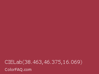 CIELab 38.463,46.375,16.069 Color is a normal red color and the nearest color is Stiletto #9c3336. Hex code #a13343 and RGB value is rgb(161,51,67). In RGB color space, this color is composed of 63% red, 20% green, 26% blue, In CMYK color space, this color is composed of 0% cyan, 68% magenta, 58% yellow , 37% black , In HSL color space, this color has a hue angle of 351° , 52% saturation and 42% lightness.