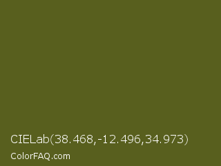 CIELab 38.468,-12.496,34.973 Color is a dark yellow color and the nearest color is Antique Bronze #665d1e. Hex code #585f1e and RGB value is rgb(88,95,30). In RGB color space, this color is composed of 35% red, 37% green, 12% blue, In CMYK color space, this color is composed of 7% cyan, 0% magenta, 68% yellow , 63% black , In HSL color space, this color has a hue angle of 66° , 52% saturation and 25% lightness.