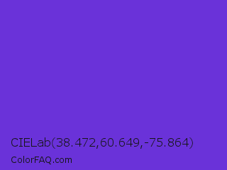 CIELab 38.472,60.649,-75.864 Color is a normal indigo color and the nearest color is Purple Heart Crayola #652dc1. Hex code #6a32d9 and RGB value is rgb(106,50,217). In RGB color space, this color is composed of 42% red, 20% green, 85% blue, In CMYK color space, this color is composed of 51% cyan, 77% magenta, 0% yellow , 15% black , In HSL color space, this color has a hue angle of 260° , 69% saturation and 52% lightness.