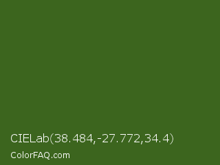 CIELab 38.484,-27.772,34.4 Color is a dark green color and the nearest color is Dell #396413. Hex code #3c651e and RGB value is rgb(60,101,30). In RGB color space, this color is composed of 24% red, 40% green, 12% blue, In CMYK color space, this color is composed of 41% cyan, 0% magenta, 70% yellow , 60% black , In HSL color space, this color has a hue angle of 95° , 54% saturation and 26% lightness.