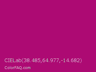 CIELab 38.485,64.977,-14.682 Color is a normal magenta color and the nearest color is Flirt #a2006d. Hex code #ad0a74 and RGB value is rgb(173,10,116). In RGB color space, this color is composed of 68% red, 4% green, 45% blue, In CMYK color space, this color is composed of 0% cyan, 94% magenta, 33% yellow , 32% black , In HSL color space, this color has a hue angle of 321° , 89% saturation and 36% lightness.