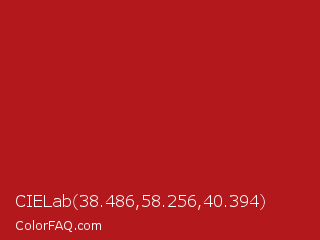 CIELab 38.486,58.256,40.394 Color is a normal red color and the nearest color is Carnelian #b31b1b. Hex code #b3191c and RGB value is rgb(179,25,28). In RGB color space, this color is composed of 70% red, 10% green, 11% blue, In CMYK color space, this color is composed of 0% cyan, 86% magenta, 84% yellow , 30% black , In HSL color space, this color has a hue angle of 359° , 75% saturation and 40% lightness.