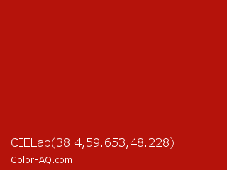 CIELab 38.4,59.653,48.228 Color is a normal red color and the nearest color is International Orange Engineering #ba160c. Hex code #b5130b and RGB value is rgb(181,19,11). In RGB color space, this color is composed of 71% red, 7% green, 4% blue, In CMYK color space, this color is composed of 0% cyan, 90% magenta, 94% yellow , 29% black , In HSL color space, this color has a hue angle of 3° , 89% saturation and 38% lightness.