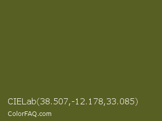 CIELab 38.507,-12.178,33.085 Color is a dark yellow color and the nearest color is Dark Moss Green #4a5d23. Hex code #585f22 and RGB value is rgb(88,95,34). In RGB color space, this color is composed of 35% red, 37% green, 13% blue, In CMYK color space, this color is composed of 7% cyan, 0% magenta, 64% yellow , 63% black , In HSL color space, this color has a hue angle of 67° , 47% saturation and 25% lightness.