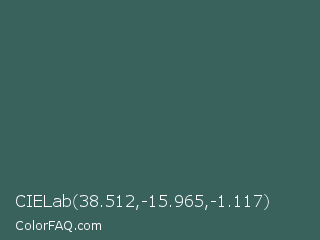 CIELab 38.512,-15.965,-1.117 Color is a dark cyan color and the nearest color is Mineral Green #3f5d53. Hex code #39625c and RGB value is rgb(57,98,92). In RGB color space, this color is composed of 22% red, 38% green, 36% blue, In CMYK color space, this color is composed of 42% cyan, 0% magenta, 6% yellow , 62% black , In HSL color space, this color has a hue angle of 171° , 26% saturation and 30% lightness.