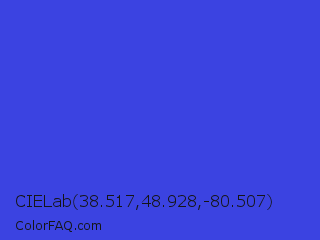 CIELab 38.517,48.928,-80.507 Color is a normal blue color and the nearest color is Palatinate Blue #273be2. Hex code #3b43e1 and RGB value is rgb(59,67,225). In RGB color space, this color is composed of 23% red, 26% green, 88% blue, In CMYK color space, this color is composed of 74% cyan, 70% magenta, 0% yellow , 12% black , In HSL color space, this color has a hue angle of 237° , 73% saturation and 56% lightness.
