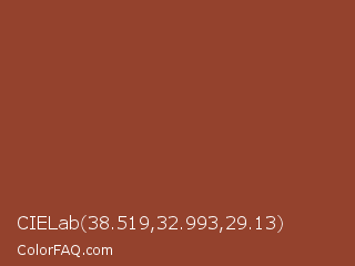 CIELab 38.519,32.993,29.13 Color is a normal red color and the nearest color is Chestnut #954535. Hex code #94422d and RGB value is rgb(148,66,45). In RGB color space, this color is composed of 58% red, 26% green, 18% blue, In CMYK color space, this color is composed of 0% cyan, 55% magenta, 70% yellow , 42% black , In HSL color space, this color has a hue angle of 12° , 53% saturation and 38% lightness.