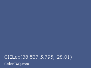CIELab 38.537,5.795,-28.01 Color is a normal blue color and the nearest color is Purple Navy #4e5180. Hex code #465a88 and RGB value is rgb(70,90,136). In RGB color space, this color is composed of 27% red, 35% green, 53% blue, In CMYK color space, this color is composed of 49% cyan, 34% magenta, 0% yellow , 47% black , In HSL color space, this color has a hue angle of 222° , 32% saturation and 40% lightness.