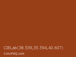 CIELab 38.539,35.594,40.607 Color is a normal orange color and the nearest color is Cognac #9f381d. Hex code #993f18 and RGB value is rgb(153,63,24). In RGB color space, this color is composed of 60% red, 25% green, 9% blue, In CMYK color space, this color is composed of 0% cyan, 59% magenta, 84% yellow , 40% black , In HSL color space, this color has a hue angle of 18° , 73% saturation and 35% lightness.