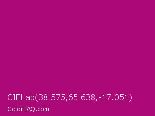 CIELab 38.575,65.638,-17.051 Color is a normal magenta color and the nearest color is Flirt #a2006d. Hex code #ad0878 and RGB value is rgb(173,8,120). In RGB color space, this color is composed of 68% red, 3% green, 47% blue, In CMYK color space, this color is composed of 0% cyan, 95% magenta, 31% yellow , 32% black , In HSL color space, this color has a hue angle of 319° , 91% saturation and 35% lightness.