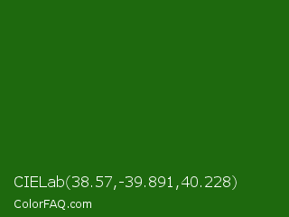 CIELab 38.57,-39.891,40.228 Color is a dark green color and the nearest color is Lincoln Green #195905. Hex code #1e690e and RGB value is rgb(30,105,14). In RGB color space, this color is composed of 12% red, 41% green, 5% blue, In CMYK color space, this color is composed of 71% cyan, 0% magenta, 87% yellow , 59% black , In HSL color space, this color has a hue angle of 109° , 76% saturation and 23% lightness.
