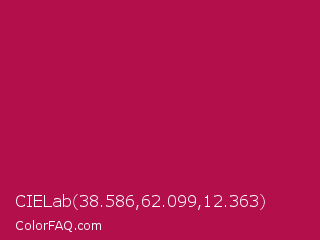 CIELab 38.586,62.099,12.363 Color is a normal rose color and the nearest color is Pictorial Carmine #c30b4e. Hex code #b30f4a and RGB value is rgb(179,15,74). In RGB color space, this color is composed of 70% red, 6% green, 29% blue, In CMYK color space, this color is composed of 0% cyan, 92% magenta, 59% yellow , 30% black , In HSL color space, this color has a hue angle of 338° , 85% saturation and 38% lightness.