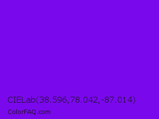 CIELab 38.596,78.042,-87.014 Color is a normal violet color and the nearest color is Violet Color Wheel #7f00ff. Hex code #7a08ed and RGB value is rgb(122,8,237). In RGB color space, this color is composed of 48% red, 3% green, 93% blue, In CMYK color space, this color is composed of 49% cyan, 97% magenta, 0% yellow , 7% black , In HSL color space, this color has a hue angle of 270° , 93% saturation and 48% lightness.