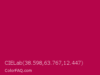 CIELab 38.598,63.767,12.447 Color is a normal rose color and the nearest color is Pictorial Carmine #c30b4e. Hex code #b5054a and RGB value is rgb(181,5,74). In RGB color space, this color is composed of 71% red, 2% green, 29% blue, In CMYK color space, this color is composed of 0% cyan, 97% magenta, 59% yellow , 29% black , In HSL color space, this color has a hue angle of 336° , 95% saturation and 36% lightness.