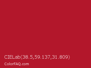 CIELab 38.5,59.137,31.809 Color is a normal red color and the nearest color is Upsdell Red #ae2029. Hex code #b3172b and RGB value is rgb(179,23,43). In RGB color space, this color is composed of 70% red, 9% green, 17% blue, In CMYK color space, this color is composed of 0% cyan, 87% magenta, 76% yellow , 30% black , In HSL color space, this color has a hue angle of 352° , 77% saturation and 40% lightness.