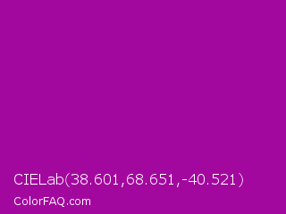 CIELab 38.601,68.651,-40.521 Color is a normal magenta color and the nearest color is Violet Eggplant #991199. Hex code #a3089e and RGB value is rgb(163,8,158). In RGB color space, this color is composed of 64% red, 3% green, 62% blue, In CMYK color space, this color is composed of 0% cyan, 95% magenta, 3% yellow , 36% black , In HSL color space, this color has a hue angle of 302° , 91% saturation and 34% lightness.