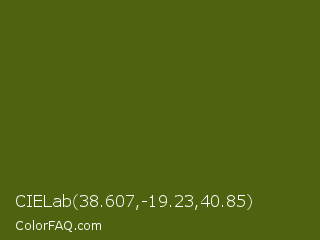 CIELab 38.607,-19.23,40.85 Color is a very dark lime color and the nearest color is Saratoga #555b10. Hex code #4f620f and RGB value is rgb(79,98,15). In RGB color space, this color is composed of 31% red, 38% green, 6% blue, In CMYK color space, this color is composed of 19% cyan, 0% magenta, 85% yellow , 62% black , In HSL color space, this color has a hue angle of 74° , 73% saturation and 22% lightness.