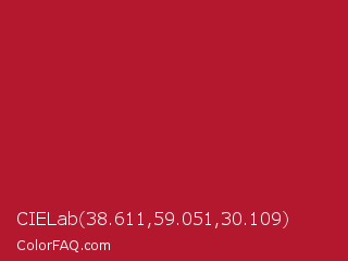 CIELab 38.611,59.051,30.109 Color is a normal red color and the nearest color is Upsdell Red #ae2029. Hex code #b3182e and RGB value is rgb(179,24,46). In RGB color space, this color is composed of 70% red, 9% green, 18% blue, In CMYK color space, this color is composed of 0% cyan, 87% magenta, 74% yellow , 30% black , In HSL color space, this color has a hue angle of 351° , 76% saturation and 40% lightness.