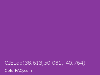 CIELab 38.613,50.081,-40.764 Color is a normal purple color and the nearest color is Vivid Violet #803790. Hex code #88379e and RGB value is rgb(136,55,158). In RGB color space, this color is composed of 53% red, 22% green, 62% blue, In CMYK color space, this color is composed of 14% cyan, 65% magenta, 0% yellow , 38% black , In HSL color space, this color has a hue angle of 287° , 48% saturation and 42% lightness.