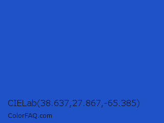 CIELab 38.637,27.867,-65.385 Color is a normal blue color and the nearest color is New Car #214fc6. Hex code #1f52c7 and RGB value is rgb(31,82,199). In RGB color space, this color is composed of 12% red, 32% green, 78% blue, In CMYK color space, this color is composed of 84% cyan, 59% magenta, 0% yellow , 22% black , In HSL color space, this color has a hue angle of 222° , 73% saturation and 45% lightness.