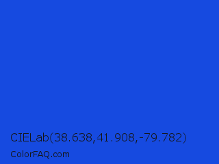 CIELab 38.638,41.908,-79.782 Color is a normal blue color and the nearest color is Palatinate Blue #273be2. Hex code #164ae0 and RGB value is rgb(22,74,224). In RGB color space, this color is composed of 9% red, 29% green, 88% blue, In CMYK color space, this color is composed of 90% cyan, 67% magenta, 0% yellow , 12% black , In HSL color space, this color has a hue angle of 225° , 82% saturation and 48% lightness.