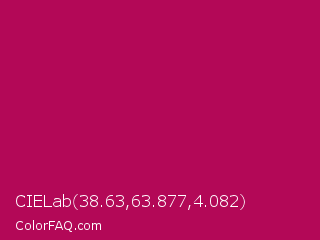 CIELab 38.63,63.877,4.082 Color is a normal rose color and the nearest color is Lipstick #ab0563. Hex code #b30857 and RGB value is rgb(179,8,87). In RGB color space, this color is composed of 70% red, 3% green, 34% blue, In CMYK color space, this color is composed of 0% cyan, 96% magenta, 51% yellow , 30% black , In HSL color space, this color has a hue angle of 332° , 91% saturation and 37% lightness.